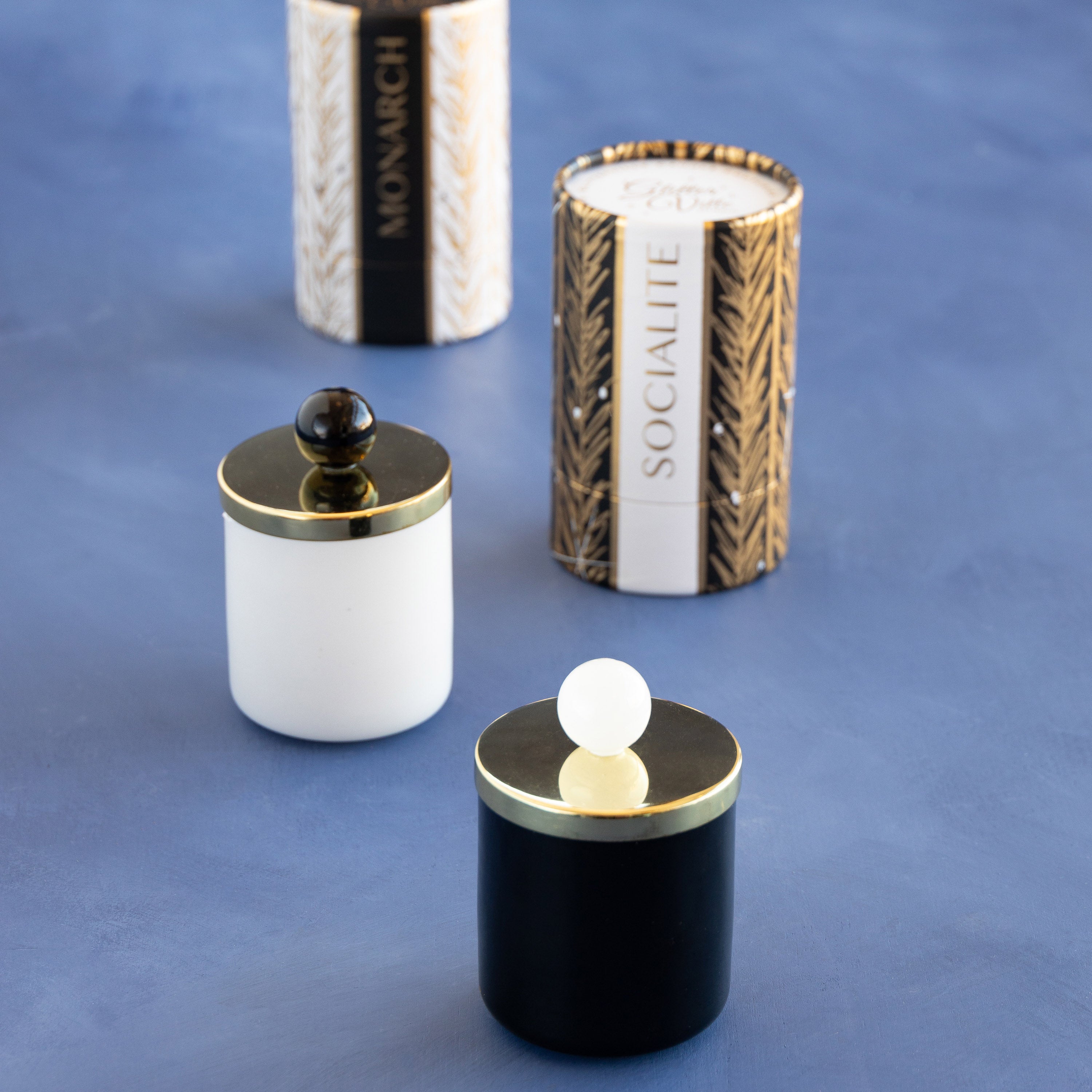 Offered in a black or white La Cuvette, the Demi scented candle is offered in two scents - socialite or monarch.